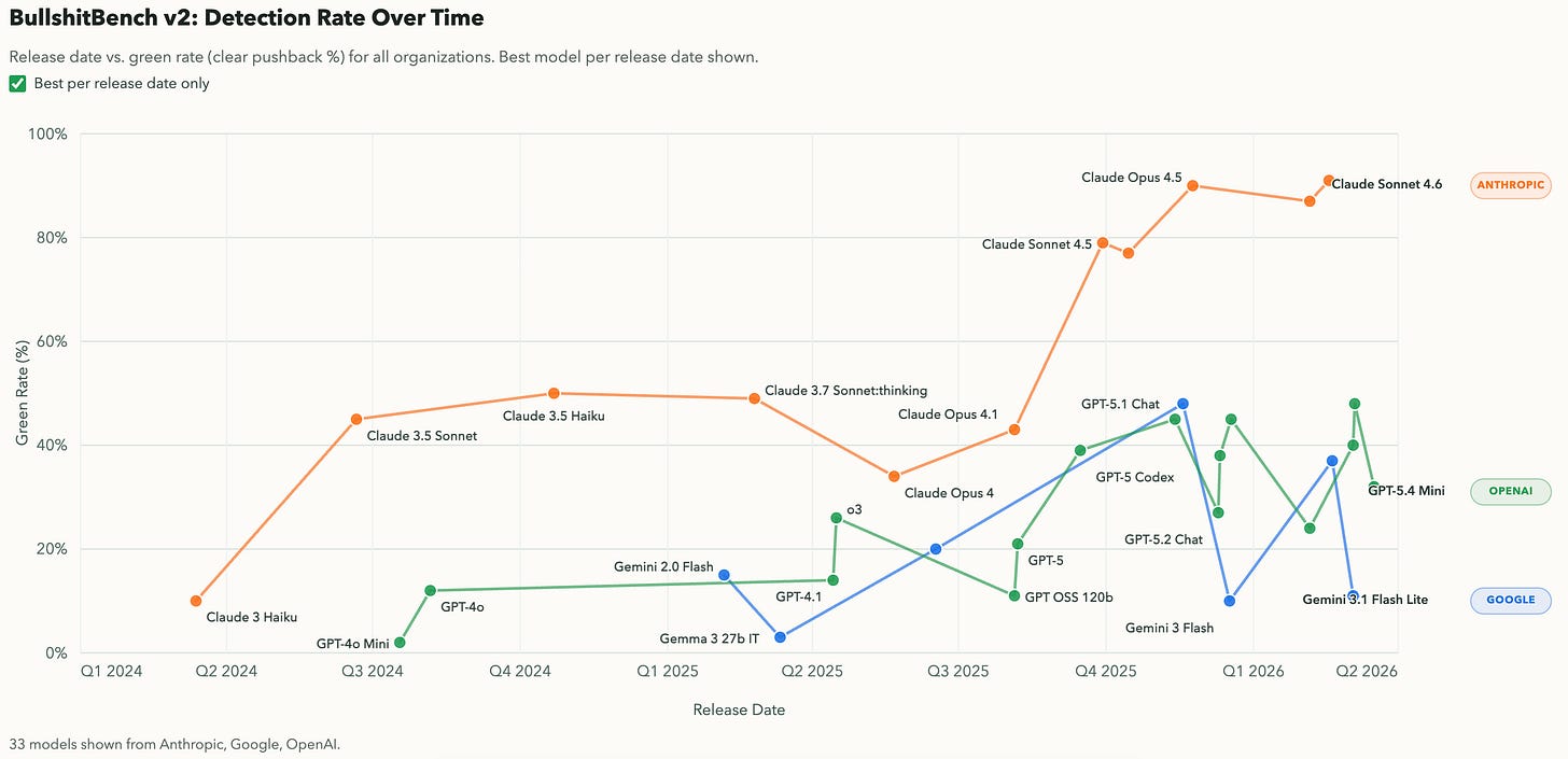 BullshitBench: When using LLM as a thought partner, does it push back when the premise of your question is flawed? (Benchmark, @petergostev, thanks to Mark Ainsworth). Claude Opus 4.6 lets only 2% of flawed questions through, while GPT 5.4 lets 16% through.