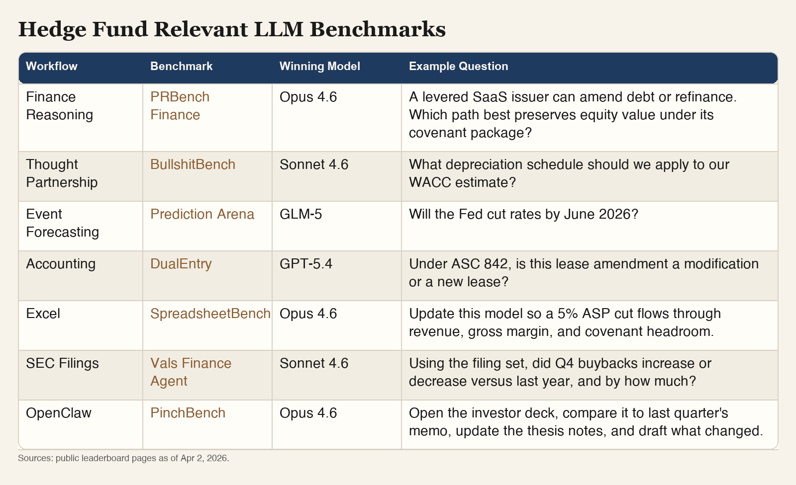 LLM benchmarks score models against real world tasks designed by experts. These popular ones cover various investment research workflows: accounting (DualEntry), excel (SpreadsheetBench), SEC filings (Vals), finance reasoning (PRBench), event forecasting (Prediction Arena), thought partnership (BullshitBench) and OpenClaw (PinchBench):