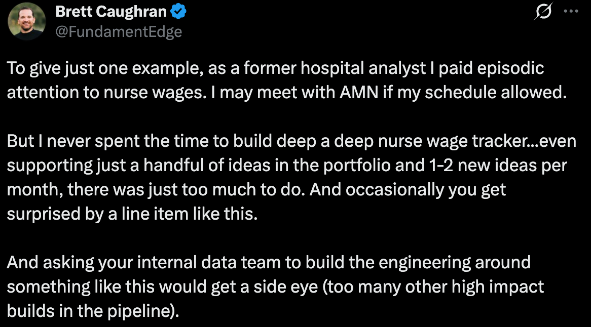 Former Healthcare PM vibecodes datasets his internal datateam would have never prioritized (@FundamentalEdge)